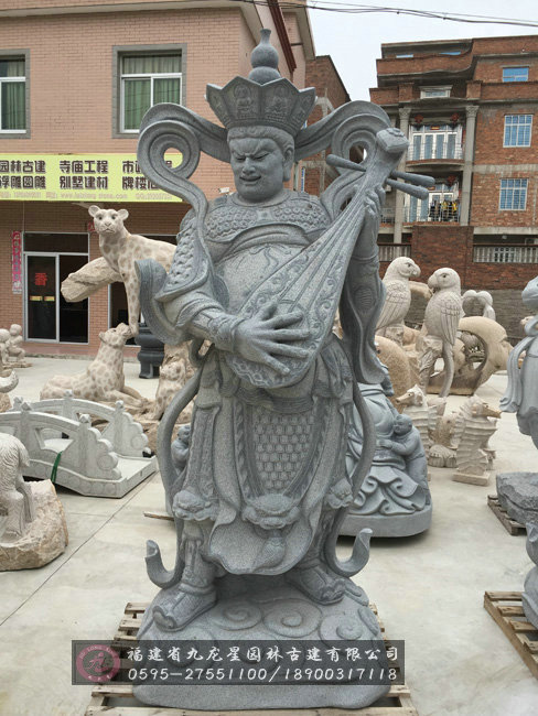 石雕東方持國(guó)天王.名多羅托,身著白色,穿甲胄,手持琵琶琴。用琵琶彈奏,使之缽依佛門(mén),以音樂(lè)感化眾生護(hù)持國(guó)土。其職責(zé)是:保護(hù)東方國(guó)土,保護(hù)眾生,保護(hù)東方弗提婆洲人民。