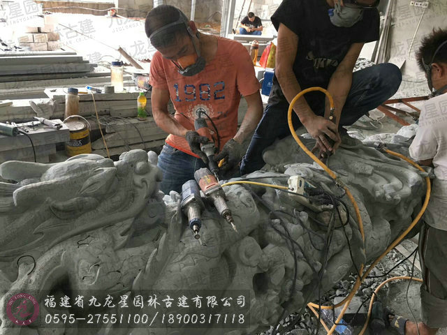 大量石雕青石龍柱現(xiàn)場(chǎng)加工中